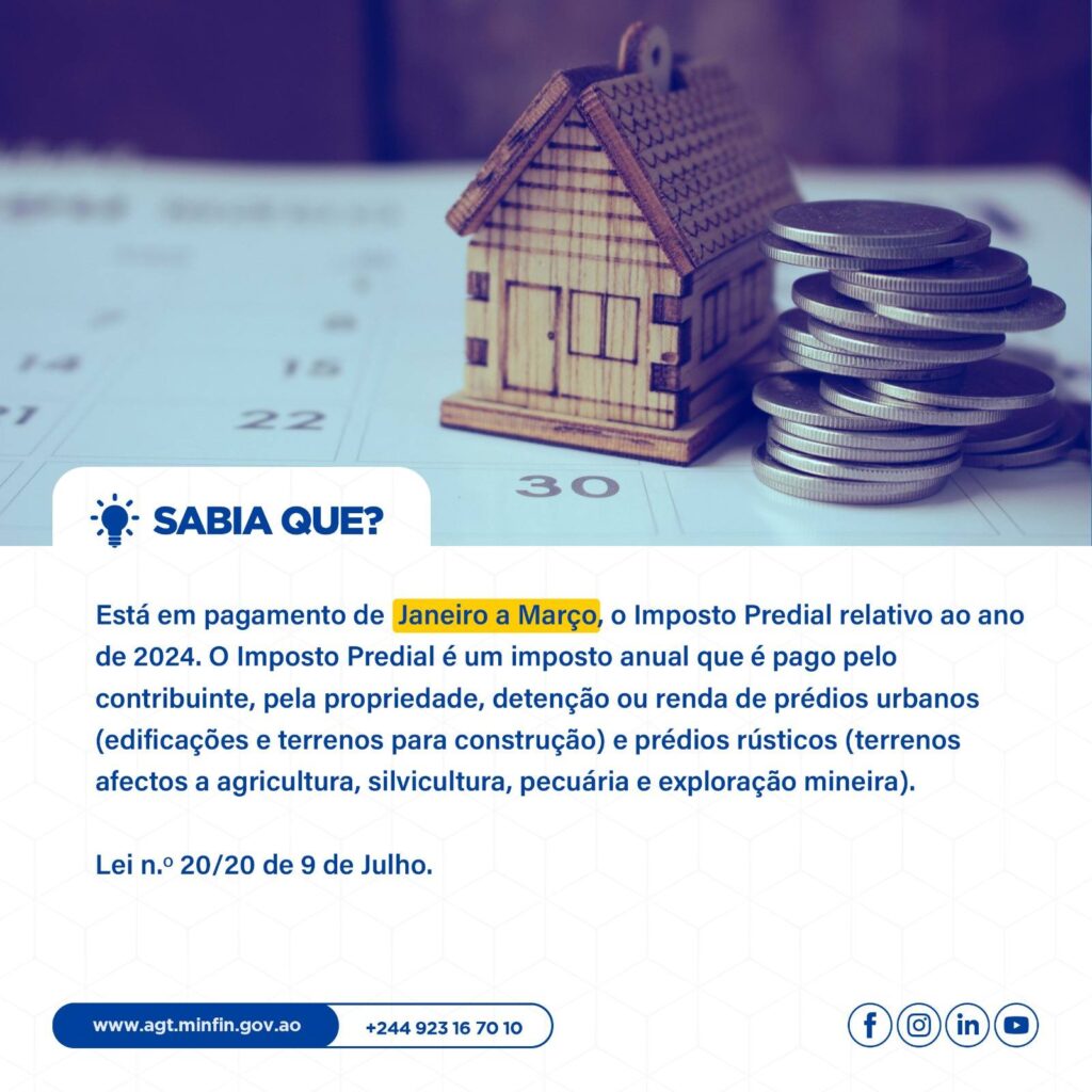 A Administração Geral Tributária (AGT) informa que está em curso o prazo voluntário para o cumprimento das Obrigações Tributárias do Imposto Predial.
